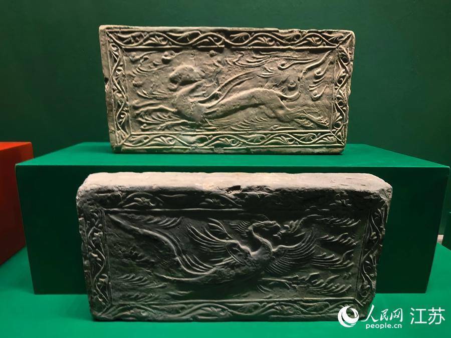 南朝白虎与朱雀画像砖。人民网记者 王继亮摄