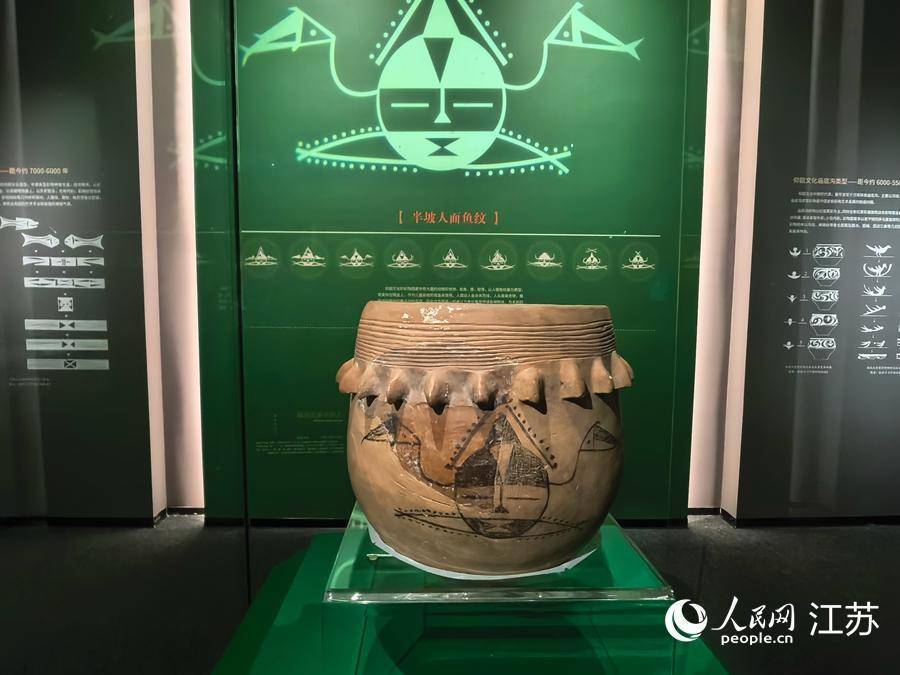 展出的新石器时代人面鱼纹尖底器。人民网记者 王继亮摄